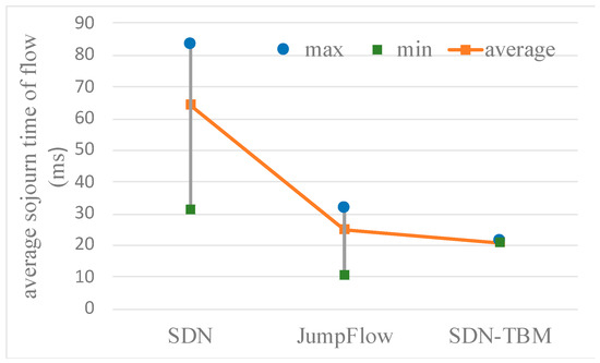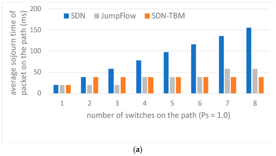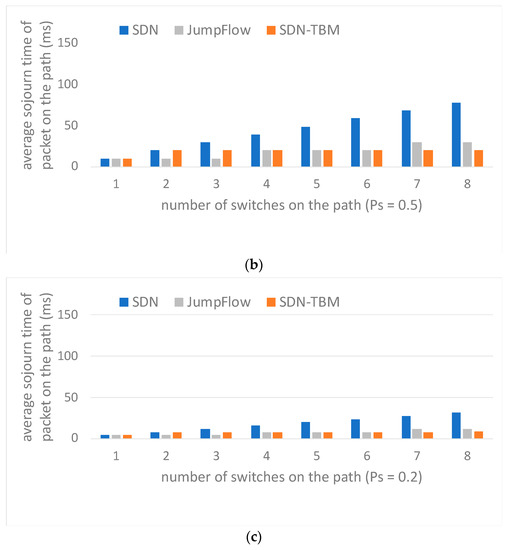 The numerical results are shown in Figure 9. The figure shows that both SDN-TBM and JumpFlow approaches can effectively reduce the sojourn time of packet on a path. The JumpFlow approach performs better than the SDN-TBM approach when the number of switches on a path is less than 3. When the number of switches on a path is in the range from 4 to 6, the average sojourn time of packet in our approach is close to the JumpFlow approach. When the number of switches on a path exceeds 6, our approach is superior to the JumpFlow approach. Although the JumpFlow approach performs better than or nearly as well as our approach when the number of switches on a path is less than or equal to 6, but the JumpFlow approach has many limitations in the SDN environment. First, with JumpFlow approach, the SDN network needs to support the VLAN protocol. Second, the JumpFlow approach can only forward packets to the designated port and cannot forward packets to different routes based on the packet information. In addition, with JumpFlow approach, the number of ports in the switch affects the largest number of hops. Recording fewer hops in the VID will increase the number of requests to the controller, which increases the packet sojourn time. In addition, the JumpFlow approach cannot solve the challenges in the reactive mode of the SDN network, which are mentioned in [21]. Unlike the JumpFlow approach, our approach can fully support the features of the standard SDN and does not need to install other specific communication protocols.