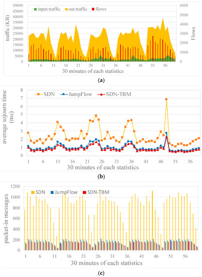 We collected real data for simulation in a set of formal commercial information systems. This dataset uses the RESTful API protocol and is characterized by a large number of flows and consists of fewer packets, which is a common traffic type for most applications today. Such a characteristic can be precisely controlled by the reactive mode of the SDN. The data period is two months. We record the traffic flows data every 30 min, and the contents include input traffic, output traffic, and flows. For convenience, we only show the 60 pieces of collected traffic flow data in Figure 10a. The properties of collected traffic flow and system parameters are shown in Table 4. Comparisons of the average sojourn time and the average number of packet-in messages among the SDN, JumpFlow, and SDN-TBM approaches are shown in Figure 10b,c, respectively. In Figure 10b, one can observe that the prominent points appeared when the number of unfamiliar flows was greater than the number of regular flows. From the Figure 10b,c, we can find that the average sojourn time and the average number of packet-in messages in the SDN-TBM approach are lower than the other approaches.