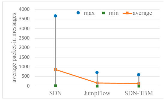 We summarize the influence of unfamiliar flows on the sojourn time of flows for the three approaches in Figure 11. The values of the SDN-TBM approach are close because any length of path sends only two packet-in messages to the controller. In the JumpFlow approach, because different path lengths send different packet-in messages to the controller, the sojourn time values are diverse. Figure 12, summarizing the influence of unfamiliar flows on the number of packet-in messages, shows a trend similar to that of the influence of unfamiliar flows on the sojourn time. Based on the simulation results, the average packet sojourn time of the SDN-TBM approach outperforms the JumpFlow approach and the conventional SDN approach as 15.81% and approximately 67.16%, respectively. In addition, the number of packet-in messages in the SDN-TBM approach outperforms the JumpFlow approach and the conventional SDN approach as 15.97% and 83.69%, respectively.