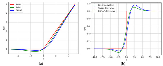 (a) The comparative graph and (b) the first-order derivatives of the ReLU function, the Swish function and the proposed EANAF.