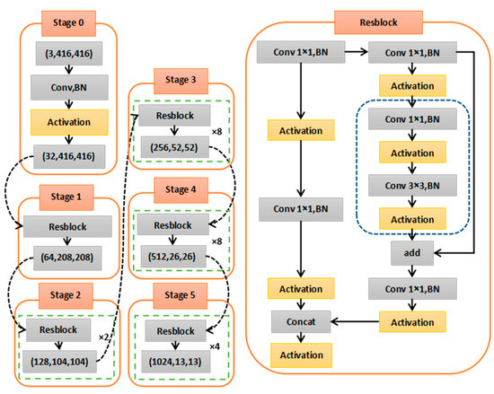 Figure 4 illustrates the structure diagram of CSPDarknet [11] (with the activation highlighted). It can be further divided into two parts. The first part sequentially performs convolution processing, normalization processing and activation function processing on the input image while the second part is composed of five groups of the “Resblock” modules with different layers. The three-layer output of YOLO v4 [11] is the feature layer processed by the deep “Resblock” module.