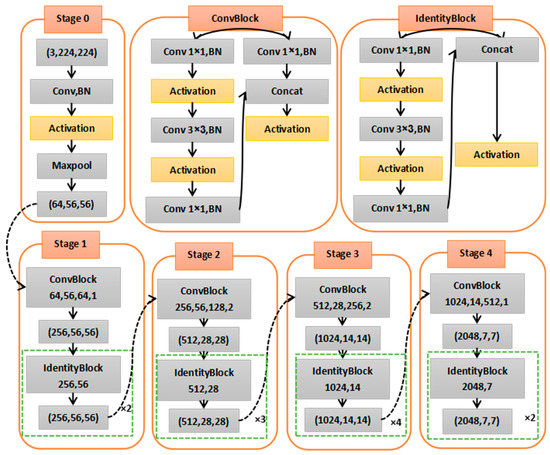 We selected RetinaNet [10] and YOLO-v4 [11] as two representative networks, with the backbone as ResNet [9] and the CSPDarkNet [11], respectively. More precisely, the backbone of the RetinaNet [10], ResNet [9], can be further divided into two parts. The first part consists of the convolution operation, standard layer, activation function and maximum pooling layer while the second part of the consists of four groups of the “Conv Block” and the “Identity Block” with different operation times. Figure 3 illustrates the backbone structure of ResNet (with the activation highlighted).