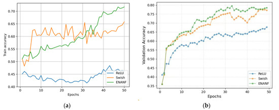 We choose ReLU [15,16] and Swish [28] as two benchmark activation functions for comparison. Compared with the LeakyReLU function [18] and the ReLU6 function [17], ReLU [15,16] not only has less computation, but also satisfies the right-side non-saturation and stronger negative sample robustness. Compared with functions such as the ELU function [22] and GELU [25], the lower computational complexity of ReLU function [15,16] is a big advantage. The Sigmoid function [5], Tanh function [13] and Softsign function [14] are not suitable for the convolutional neural networks. The Swish function [28] is chosen because it has all the four desired properties for activation functions, while the non-smoothness of the h-swish function [30] makes it only suitable for light networks. Figure 5a shows the validation accuracy of the ReLU function, the Swish function and the proposed EANAF during the training phase and Figure 5b shows the validation accuracy of the ReLU function, the Swish function and the proposed EANAF during the testing phase. It can be easily seen that the proposed EANAF outperforms ReLU and Swish in both training and testing phases.