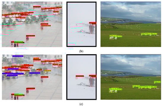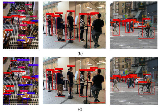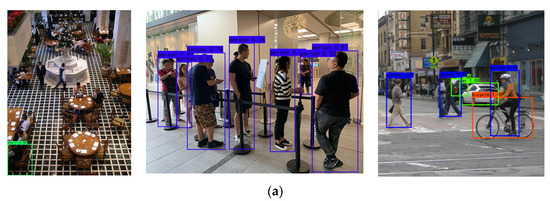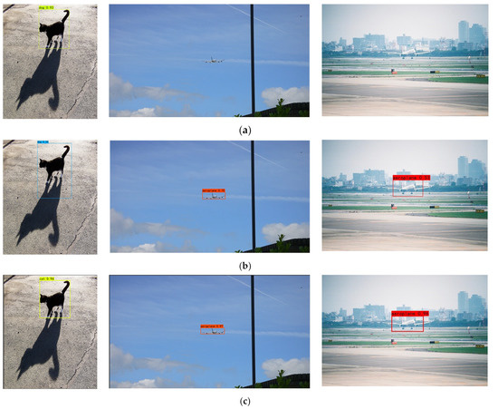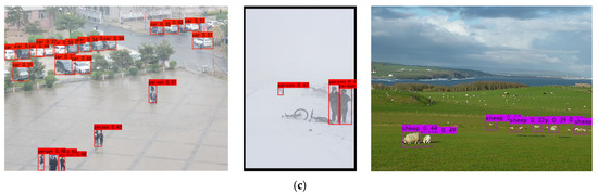 The visual comparison of using the ReLU function [15,16], the Swish function [28] and the proposed EANAF as the activation function for the CSPDarknet [11] backbone of YOLO v4 [11] when there are many types of objects, and the occlusion is serious. (a) The visual results of using ReLU. (b) The visual results of using Swish. (c) The visual results of using EANAF.