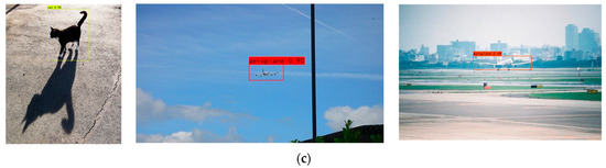 The visual results of using the ReLU function [15,16], the Swish function [28] and the proposed EANAF as the activation function for the CSPDarknet [11] backbone of YOLO v4 [11] for small-object detection in a complex environment. (a) The visual results of using ReLU. (b) The visual results of using Swish. (c) The visual results of using EANAF.