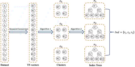 An example of building the index for a document set is illustrated in Figure 2. From Figure 2, after using clustering algorithm, we suppose that F is divided into three clusters , , and . For each cluster, , we first convert each document in into a leaf node. Then, based on these leaf nodes, we construct the internal nodes in a bottom–up manner using Algorithm 2. Finally, we combine these three index tree as the plaintext index of the document set F.