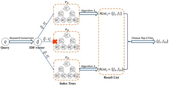 In this example, we assume that the search aim is to find the documents with the top two relevance scores. From Figure 3, the entire search process consists of three parts. Firstly, we transform the query, Q, into an IDF vector , and then calculate the relevance score between the query, Q, and the three index tree roots, . Suppose that we retrieve only two index trees whose root nodes are most relevant to the query, Q. According to the calculation results, index tree 1 and tree 3 are chosen as our retrieval targets. Secondly, we apply Algorithm 3 to perform the retrieval operation on the index tree and obtain and as the result of the query on index trees 1 and 3, respectively. Thirdly, we combine the query results of index tree 1 and tree 3 and return the two documents with the highest correlation scores as the final query results.