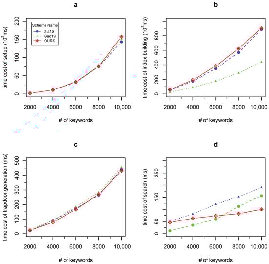 In this section, we evaluate the proposed F-SSE-RS scheme theoretically and experimentally and give a detailed experiment to quantify the space–time efficiency of the scheme. We implemented the proposed scheme in Python and tested it on a real dataset, i.e., Enron e-mail datasets [28]. In addition, our experimental runtime environment includes an Intel(R) Core(TM) i7 CPU whose frequency is 2.90 GHz and 16 GB of RAM. To illustrate the advantages of the proposed scheme, we compare it with two similar previous schemes in terms of the time complexity of index construction, trapdoor generation and searching, and the space complexity of indexes and trapdoors. For convenience, we denote the schemes proposed in [8,9] as Xia16 and Guo19, respectively. In addition, we also conduct experiments on the accuracy of these schemes to demonstrate the merits of the proposed schemes more comprehensively.