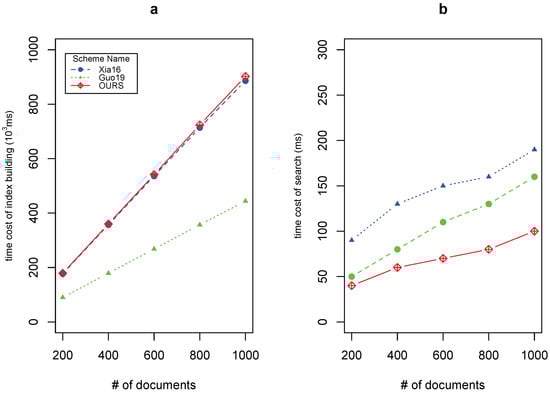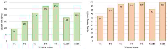 In the search phase, because the index of the proposed scheme contains k index trees and the height of each index tree is , the search time of each index tree is , where is the length of the vector contained in the internal node. In addition, when the search operation reaches the leaf nodes, the similarity calculation will be performed. The time consumption of similarity calculation for each index tree is since the dimension of the vector is . Based on the above analysis, assuming that we select t most relevant index trees for querying, the search time of the proposed scheme is . For Xia16, it has to search the index tree with height . Its query time is . For Guo19, its query time is since the vector length of the internal node is .