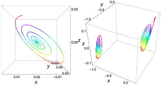 Numerical simulations of local asymptotically stability of the Chua system. (letf) Stability of system (6). (right) Stability of system (7).