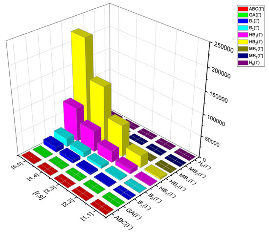 Let be a Carbon Allotrope. The total number of vertices and edges of is depicted as and . By using the definitions of VDB multiplicative TIs and the Edge partition, the following results are obtained as follows and Figure 2 shows the 3D plots of the Results.