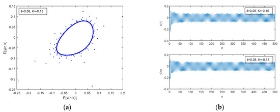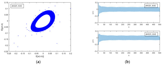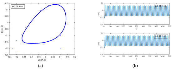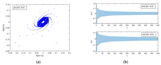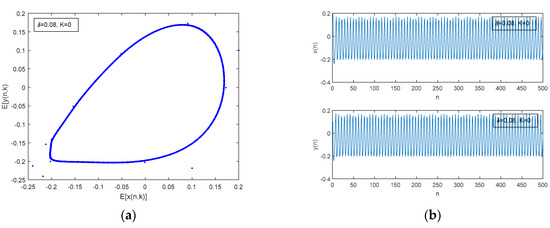 Because the intensity of is very small, when intensity , phase trajectories and the time history diagrams of EMR of equivalent system (12) gradually converge to zero in Figure 2 and Figure 3a. We know that the stochastic lagged discrete ecosystem occurs bifurcation, which is shown by Figure 2. When , the phase trajectories and time history diagrams of (12) that converge a limit cycle is shown in Figure 4. When the random intensity , the system limits cycle amplitude increases are shown in Figure 5. From Figure 2, Figure 3, Figure 4, Figure 5and Figure 6, under the condition that the system is not controlled, it can be seen that the system limit loop increases as the stochastic intensity continues to increase, which also indicates that the intensity of external perturbations affects the stochastic lagged ecosystem dynamic behavior. It affects the stability of the ecosystem and places the equilibrium point of the system in an unstable state.