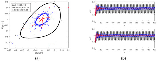 Next, Figure 11 shows the above design of the control function of random delay discrete control effect of the ecosystem, we will find that the system with the limit cycle amplitude control function coefficient decreases gradually, until a steady state is reached, such as the red part of the phase diagram (a), and the time history diagram (b) refers to a stable state.