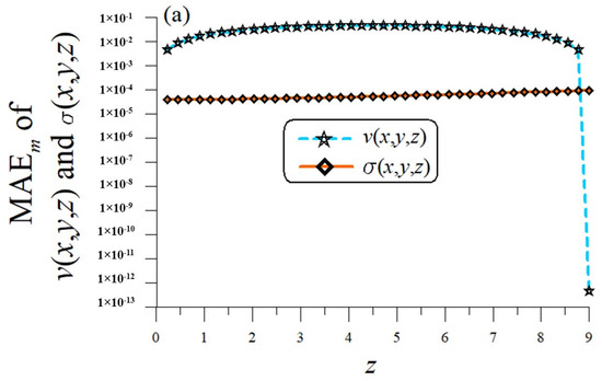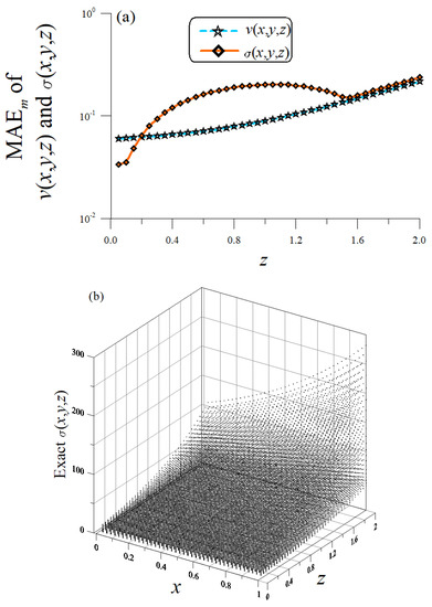 We can acquire P(x, y, z) by inserting Equation (34) into Equation (33). Under the parameters: d = 1, e = f = 2, p1 = 2, q1 = 5, p2 = 2, q2 = 4, and a noise with s = 0.4. We employ the HFM to acquire the accurate solutions, as demonstrated in Figure 2, with the maximum absolute value of v being 19.8, the maximum absolute error (MAEm) of v being 0.218, and the MAEm of σ is 0.237. Note that the maximum result of σ is 296.83, and the result em(σ) = 1.49 × 10−3 is rather small. For this case, the CPU time is only 2.83 s. From this example, we reveal that these numerical results are accurate, effective, and stable even under the noise effect and moderate area.
