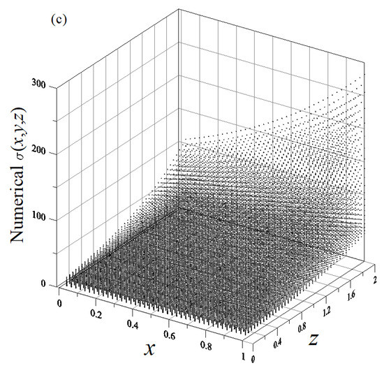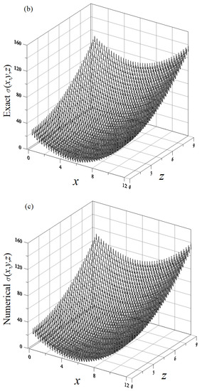 We can obtain P(x, y, z) by inserting Equation (32) into Equation (31). Under the parameters: d = 12, e = 3, f = 9, p1 = 2, q1 = 3, p2 = 3, q1 = 2, and a noise with s = 0.4. We utilize the HFM to obtain the quite accurate solutions, as displayed in Figure 1, with the maximum absolute value of v being 3416.15 and the maximum absolute error (MAEm) of v being , and the MAEm of σ is . Note that the maximum result of σ is 139.0, and the result em(σ) = 6.86 × 10−7 is very small. For this instance, the CPU time is 3.18 s. From this instance, we find that these results are very accurate, time-saving, and stable even under the noise effect and large domain. Besides, we claim that the proposed algorithm can address the electrical conductivity coefficient function σ(x, y, z) accurately inside the cuboid with the aid of the estimations of the potential on the entire boundary and the present flux on a partially accessible boundary in a bounded cuboid.