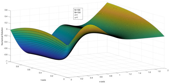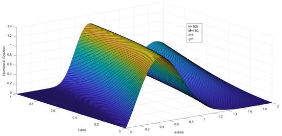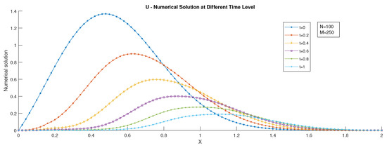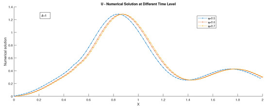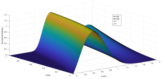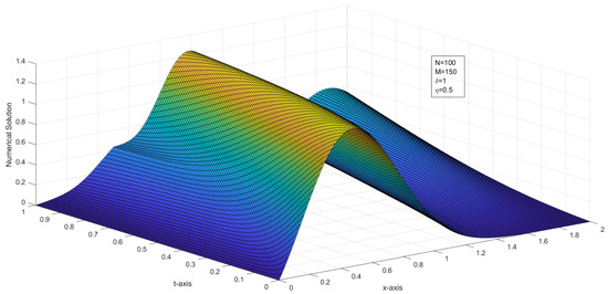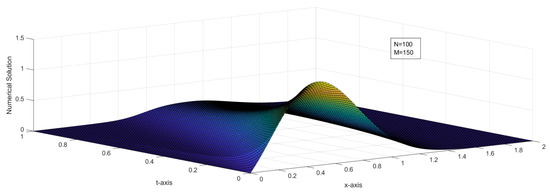 where and are the numerical solution at the node with mesh sizes and , respectively. Graphs of the numerical solutions, the numerical solution at different time levels, and the maximum pointwise error plots are drawn.