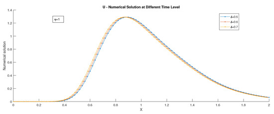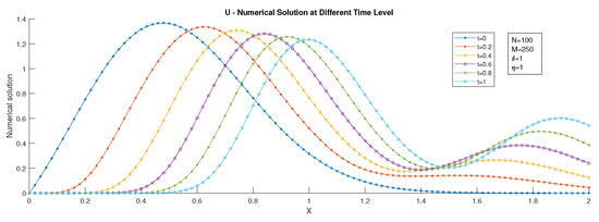 Figure 6. U–numerical solution of Example 1 at different time levels for Case 2 using BTBS. - Case 3: