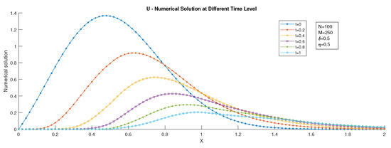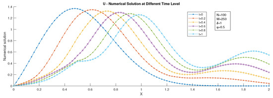 U–numerical solution of Example 2 at different time levels.