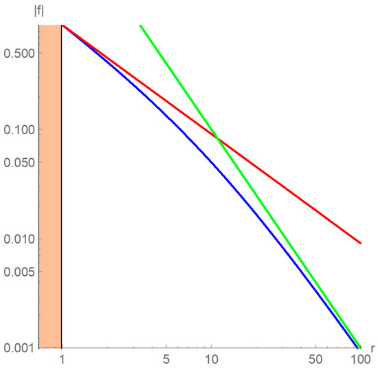 The log-log plot of Equation (13). The orange region depicts the distribution of a fluid, in which Newtonian gravity is unchanged. However, the explicit form of the force felt by a test particle depends on the distribution, and therefore its plot is not presented here. (For example, in the case of the spherical and uniform mass distribution, the solution of Equation (2) governing Newtonian gravity is quadratic in r and the force felt by a test particle inside the distribution is linear, not .) The emergent force is shown by the blue curve in the region . K and c are taken to be 1 and 10, respectively, and accordingly the scale R in Equation (14) is . The red line shows the force, whereas the force is indicated by the green line. The unsharp crossover occurs around All quantities are dimensionless.