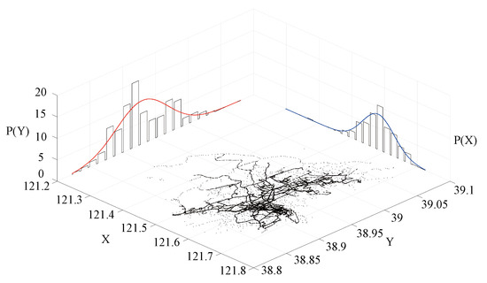 In our research environment, the amount of spatial data is huge, and the results of a parametric analysis of spatial distribution are not available. Therefore, we used a nonparametric modeling approach. In addition, as shown in Figure 2, the trajectory points in Figure 2 are typical spatial big data, and the black dots represent the trajectory points of the bus. It is observed that the trajectory points in low-longitude areas (such as Ganjingzi District) are sparse, most of the trajectory points are concentrated in the high-longitude part, and the spatial data present a skewed distribution. The widely adopted bucket width selection rule is to use Sturges’ rule [3] with bucket width .
