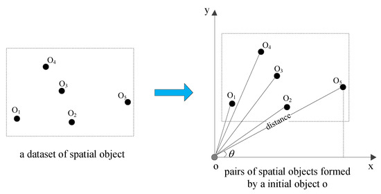Given a dataset , establish a spatial pair , , the spatial measure d, spatial offset refers to the smallest bounding rectangle (MBR) containing the spatial pair , MBR refers to the rectangle with the smallest perimeter L satisfying the relationship , which is uniquely represented by and d. MBR with a smaller distance is preferred. When d is equal, a smaller is selected when , and a larger is selected when . Figure 3 is an example of space pair and MBR, as shown in Equation (10).