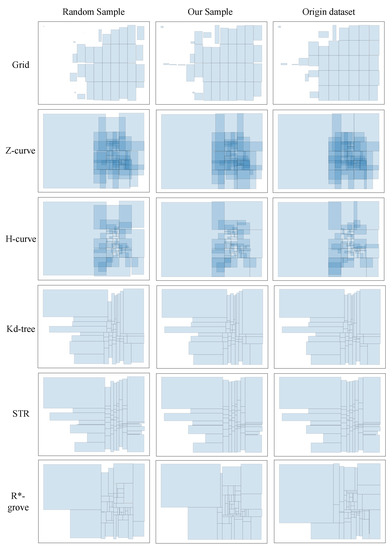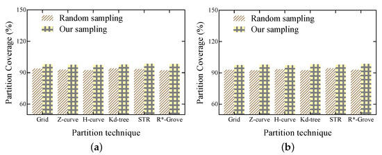 Figure 5 and Figure 6 show the advantages of the histogram bucket sampling method when using six common partitioning techniques for spatial big data partitioning on synthetic datasets and trajectory datasets, respectively. As shown in Figure 7, since the histogram bucket sampling method generates a wide range of data partitions when sampling the dataset. Thus, in each partition generated by the histogram bucket sampling method, the obtained partition coverage is much higher than that obtained using the random sampling method. Therefore, the histogram bucket sampling method is more efficient when processing large spatial data partitions.