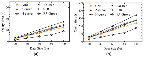 Query response time over two datasets. (a) Synthetic data. (b) Trajectory data.