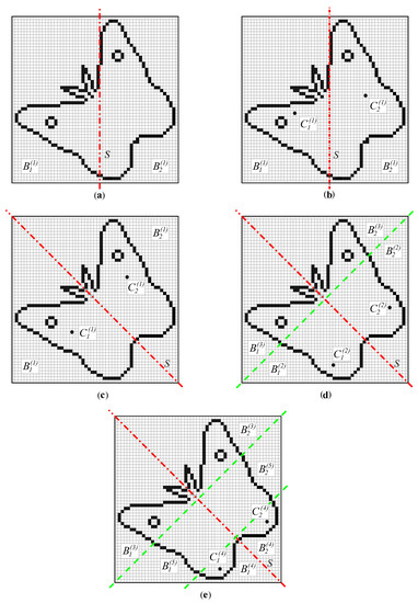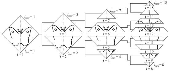 Each tree level corresponds to a complete execution of the loop indicated by the termination condition in block m. The considered object (butterfly) is symmetric, so the loop is not exited at any tree level by an early termination condition in block l. Within the loop, i increases from to . The control is then transferred to the hatched block on the right side of Figure 3, where the next tree level is established by splitting each leaf node into two halves (step 10) and adjusting and accordingly. Note that the left and the right half of each node image are split separately in blocks p and q, respectively. The operations at each of the four levels of the considered example are illustrated in the continuation. For simplicity, a node with index i will be labelled .