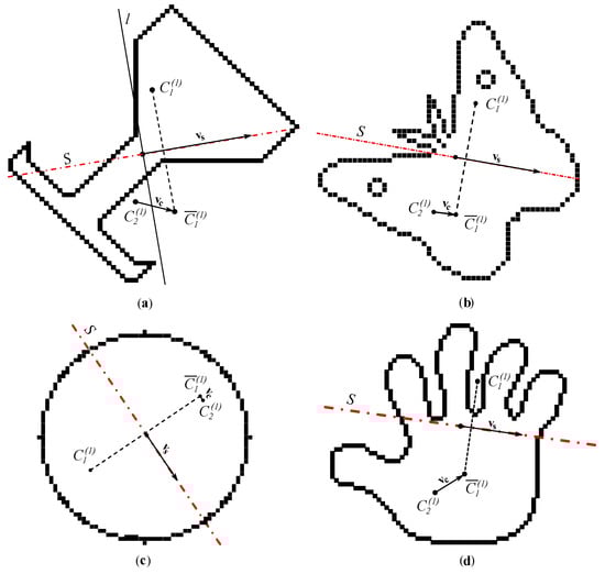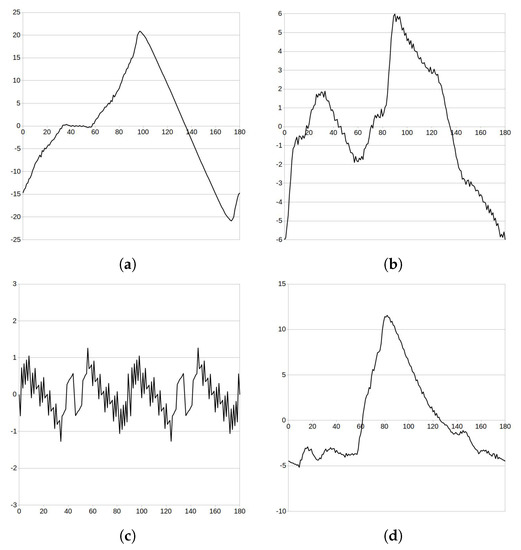 First of all, it can be observed that the curves are not smooth but only have continuity. The reason for this is the introduction of the uniform subdivision in the initialisation phase of the algorithm. In addition to the noticeable rounding errors (e.g., the of the circle is not zero in Figure 5c) which causes the unsmooth change of even if S moved fluently. For example, the sign changes 12 times for the object glass and 9 times for the object butterfly (see Figure 6a,b), indicating 12 and 9 possible symmetric positions, although only 1 exists in both objects, as we see in Figure 5. Furthermore, for the non-symmetric object hand indicates two symmetric positions. Obviously, observing just is not resistive to false positives. However, they can easily be refused by applying the algorithm from Figure 3 to zones where the changes of are detected.