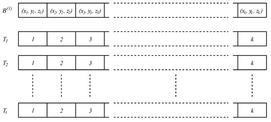 The presented algorithm, either in its basic or accelerated form with the dual-resolution grid and/or variable granularity techniques, changes the slope of the testing axis/plane and repeats the same calculations independently, which is ideal for parallel processing. Figure 7 shows the adaptation of data for this purpose. Boundary cells’ coordinates are stored in an array. Each thread , , where t is the number of available threads has its own array of indices, pointing into the array with the boundary cells . Each thread then processes its own candidate for the symmetry axis/plane. Splits of cells by S are not performed on the array, but on the corresponding arrays of indices. Two instances of the represented data structures, each representing the specific grid, are used in the case of the dual-resolution grid. OpenMP [47] was used for parallel implementation.