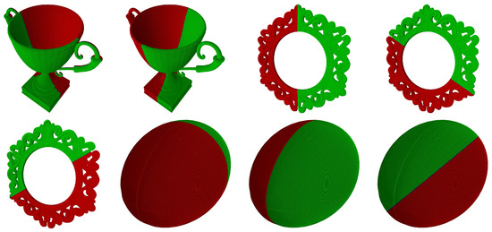 The proposed algorithm [48] for reflection symmetry detection was intensively tested on a large number of 3D objects obtained from [49,50,51], 20 of which are considered in detail in this section. They are shown in Figure 8, while details about their properties, important for our algorithm, are given in Table 1. All objects were first tested in Mode A where the algorithm classified the twelve objects as symmetric, four of which have more than one symmetric plane, while the remaining eight objects were marked as non-symmetric. The results of the algorithm for symmetric objects with only one symmetric plane are shown in Figure 9. Figure 10 gives the results for the objects trophy (two symmetries), ornate frame (six symmetries, but only three are shown), and rugby ball (with infinitely many symmetric positions, but only three are shown). The object apple, also with infinitely many symmetric positions, is not shown. Mode C was then used on the objects declared as non-symmetric to find the nearest symmetry plane for each of them. The results are shown in Figure 11. The obtained nearest symmetry planes were compared with the algorithm proposed by Hruda et al. [27] and an adequate correspondence was obtained.