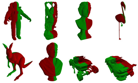 - Simari, P.D.; Kalogerakis, E.; Singh, K. Folding meshes: Hierarchical Mesh Segmentation Based on Planar Symmetry. In Proceedings of the Fourth Eurographics Symposium on Geometry Processing, Cagliary, Italy, 26–28 June 2006; pp. 111–119. [Google Scholar]