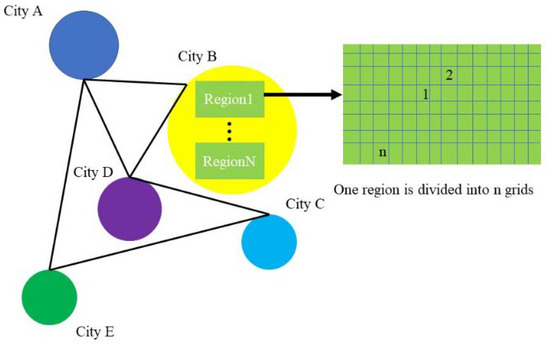 Table 1). Among them, cities are named with “capital letters”, such as city “A”, and regions are named with “capital letters Arabic numerals”, which is the administrative region of the city, such as region “A_0”. According to the statistics of the distribution of the data set, city C has the largest number of regions, totaling 135, and city B has the smallest number of regions, totaling 30.