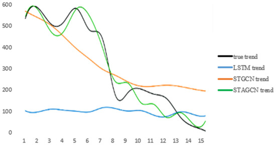 It is obvious from the chart that the prediction effect will decline in varying degrees after removing the Attention layer or GAT layer in the model. The model error of STAGCN proposed by us is the smallest. Therefore, the attention mechanism and GAT introduced can better improve the prediction accuracy of the model.