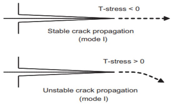 T-stress is described in this study as a cracking problem in an arc that is under internal pressure. T-stress is the transverse constraint; it activates parallel to the propagation and the lips of the crack and is frequently negligible, although various works have demonstrated its importance [,,]. Cotterell [] demonstrated that the first term of the Williams expansion, stress intensity factor (SIF), affects the start of the crack, while the second term, T-stress, regulates the stability of the crack direction (Figure 1).