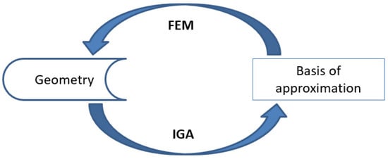 The isogeometric analysis uses non-uniform rational B-splines (NURBS) not only as a geometry discretization technology but also as a discretization tool for the analysis. The IGA is capable of producing accurate results with large meshes, whereas the finite element method (FEM) necessitates refinement. Ghorashi et al. [] demonstrated that in order to have an error less than 0.1 for both numerical approaches, X-FEM and X-IGA, they needed to employ 25,000 elements for X-FEM and only 4300 for X-IGA, as well as a computation time twice as long for X-IGA. In the IGA, the basis for describing the exact geometry is used as a basis for approximating the solution (Figure 2).