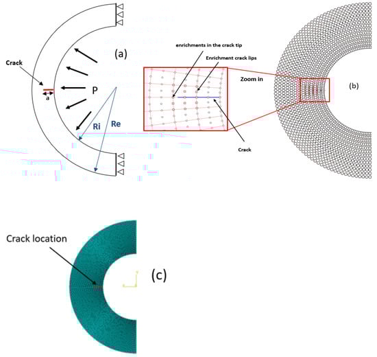 The study was performed on an arc with an internal crack; the type of crack is sharp, as illustrated in Figure 5. Table 1, Table 2 and Table 3 detail the attributes of the materials utilized (steel P264GH) and the behavior of the crack with the material is elastic. The input parameters, which include geometrical and material properties, are the first step in the computation technique in MATLAB software for the implementation of the X-IGA. The polynomial order p = 3, control points, and node vectors are used to construct the NURBS model; the number of elements is 480, and the number of control points is 2093. Secondly, we introduce the crack data, length (the crack length is between 3 and 6 mm), and coordinates of the crack points; we used the level set method to determine the crack position and select the enrichment points. The nodes are subjected to the Heaviside and crack tip functions. Then, the boundary conditions, nodal force vector, and stiffness matrix are computed. This method produces stress, strain, and displacement values, and computes T-stress by the stress different method (SDM).