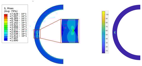 Figure 6 illustrates the distribution of the Von Mises stress computed by X-IGA and X-FEM for an internal pressure of 2.5 MPa and a = 5 mm. The variation of stresses as a function of r computed by X-IGA is shown in Figure 7; T-stress rises from −63.15 MPa for r = 0 to almost zero for r = 1. The results of both methods are similar.