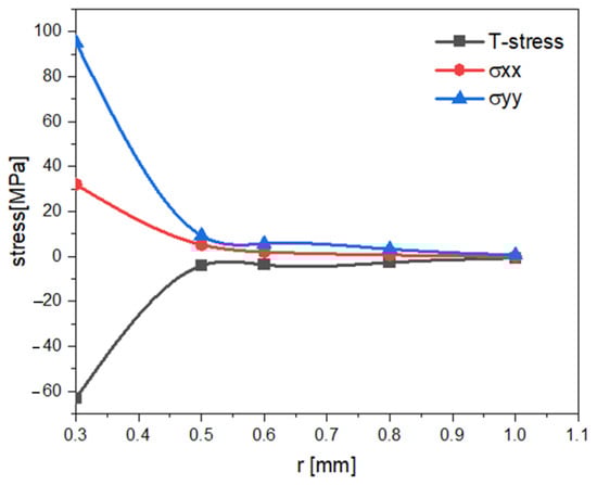T-stress was computed using a variety of approaches [,], including the stress different method (SDM) as proposed by Yang []. The idea of this method is that the errors in the numerical values of and near a crack point progress with r in the same way, and the variation must effectively eliminate errors (Figure 4). The stress T is calculated for a homogeneous material using the difference in stresses in the principal directions along the ligament and for .