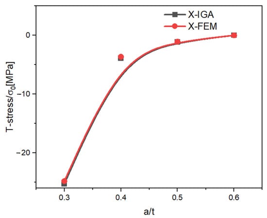 Comparison of normalized T-stress solutions, from X-IGA calculation and solution from X-FEM, for different values of a/t..