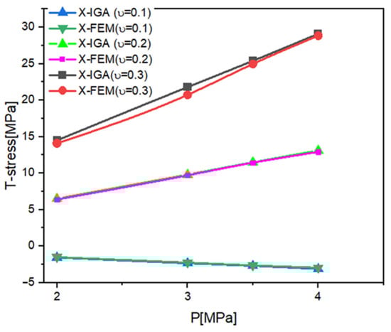 Figure 8 represents the variation of T-stress as a function of the ratio a/t, and Figure 9 shows the variation of T-stress as a function of internal pressure for different values of Poisson’s ratio , with T-stress increasing as the absolute value of p rises. Furthermore, the X-IGA values are consistent with the X-FEM values provided by the Abaqus software. An internal radius of 100 and an exterior radius of 120 are used in the following computation.