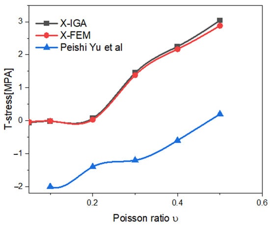 Figure 10 shows the variation of T as a function of Poisson’s ratio; we found the same variation for the two numerical approaches, X-FEM and X-IGA, with a 2.78 % difference; also it is clear that when the Poisson ratio grows, T-stress rises.