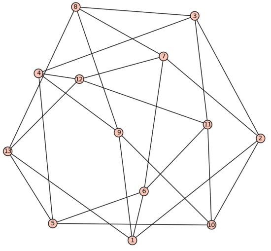 Graph is an AT tetravalent graph, which was defined in [29]. The order and size of this graph are 13 and 26, respectively. See Figure 1.