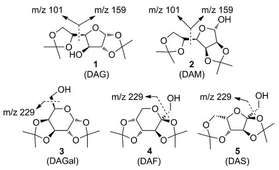For the ease of reference, they were assigned the following abbreviations: DAG (Diacetone-d-glucose) (1); DAM (Diacetone-d-mannose) (2); DAGal (Diacetone-d-galactose) (3); DAF (Diacetone-d-fructose) (4); and DAS (Diacetone-l-sorbose) (5). They were used as chemical standards in the optimization and validation of the qualitative analysis.