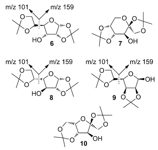 - Pascariu, M.C.; Șișu, E.; Ordodi, V.L.; Rusnac, L.M. Spectral Analysis of Diisopropylidenated Monosaccharides. Low Energy EI-MS Fragmentation Study. Chem. Bull. “Politeh.” Univ. 2011, 56, 6–11. [Google Scholar]