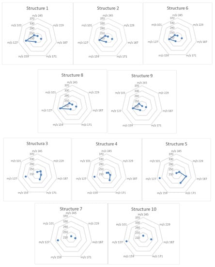 However, the most important analytical aspect was to assess whether there were mass energy differences between these ten isomers that were large enough to distinguish their chemical structures. Radar charts (in MS Excel) of the fragmentation energies as a function of the mass of the primary ions resemble fingerprints. They can be a means for the quick and accurate visual comparison of profiles (Figure 3). In these representations, only the points that correspond to the successive ionic masses in the graph are joined by a line. The points and lines, which were placed differently from the gridlines of energy, highlighted three groups of profiles for the structures: (1, 2, 6, 8, 9), (3–5) and (7, 10). In each group, the candidate structures showed only small stereochemical differences, with small exceptions. Even so, there were differences in the mass energy profiles that could be decisive in their correct identification.