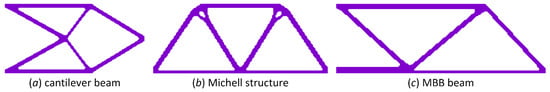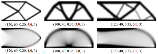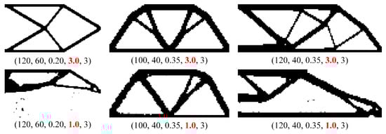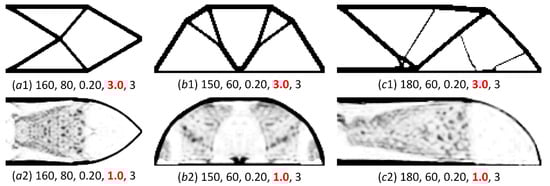 We then removed the intermediate densities in the optimized designs obtained by the material penalization model, which are shown in the first row of Figure 2. In [], several morphology-based black-and-white filters were applied to develop the three-field SIMP method; the greater effectiveness of its threshold projection has received significant attention []. As shown in the first row of Figure 3, the threshold projection is employed in the material penalization model, and the settings of the related parameters are consistent with []. We found that the densities in final results were almost equal to 0 or 1, and only an extremely limited number of intermediate densities were present. Meanwhile, if the ersatz material model and threshold projection are used, the corresponding optimized solutions are provided in the second row of Figure 3. As can be observed, even if the penalization mechanism is not employed in the topology optimization, the threshold projection still has the ability to push the generation of the topology to some extent, such as the Michell-type structure and the MBB beam. However, according to the optimized results, the operation of the threshold projection as a filter is not sufficient to push the densities towards 0 or 1. The optimized solutions are different from the benchmark designs. Moreover, the optimization is not stable and cannot arrive at the convergent condition with a reasonable topology. Hence, Huang [,] defined a floating projection constraint in the optimization using the threshold projection that can completely force the densities towards 0 or 1.