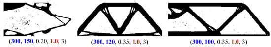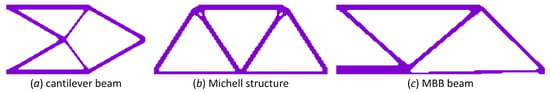 As shown in Figure 2, three benchmarks, including cantilever beam, Michell-type structure, and MBB beam, were first optimized using the classic 88 MATLAB SIMP code []. The related parameters (nelx, nely, volfrac, penal, rmin, and ft) are listed below the solutions. The final parameter ft for the filtering was fixed at 2 in all the numerical examples, and it is not displayed in Figure 2. The values nelx and nely denote the total number of the finite elements in two physical directions, respectively, and are also equal to the total number of design variables in two directions. The value of volfrac is the maximum value of the material volume fraction, and penal is the penalty parameter. As we can easily see from Figure 2, when a material penalization model with a penalty parameter equal to 3 is used, the optimized topologies with the full loading-transmission path can be achieved, and a number of intermediate densities are also produced. If the ersatz material model is set with a penalty parameter equal to 1, there is no complete loading-transmission path in the final topologies, and a large number of intermediate densities is produced. This mainly results from the ersatz material model, in which the elastic property and density in each finite element have a linear relationship, and it is not possible to enable the generation of the topology with the force-transmission path.