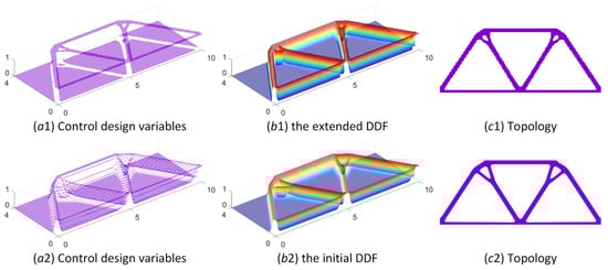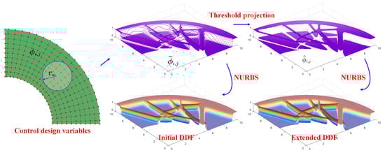 In the optimization, the DDF is employed to represent the structural topology, and structural boundaries are immersed into the iso-surface/contour of the DDF. As already discussed in [], the definition of the DDF should maintain three conditions: (1) Non-negativity; (2) strict binding within 0–1; and (3) non-negative derivatives. Moreover, the smoothness and continuity of the DDF have a significant effect on the optimized solutions. The development of the smoothness mechanism using the Shepard function and maintaining higher-order continuity using NURBS basis functions are imperative. However, although the optimized designs have smooth structural boundaries and distinct material interfaces, the transition area from 0 to 1 in the designs has a number of intermediate densities [,,], which enhance the numerical errors due to the material penalization model in the evaluation of material elastic properties. In the current work, we first focus on developing an extended DDF by introducing threshold projection, which can reduce the number of intermediate densities in the optimization. The construction of the extended DDF involves three components: (1) Smoothness; (2) continuity; and (3) binary property. The detailed steps are given as follows, shown in Figure 5: