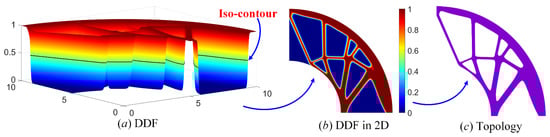 Furthermore, NURBS is a response surface for the design domain. In the construction of the extended DDF, the densities at the control points work as control coefficients, which means that the DDF can be also viewed as a density-response surface with a higher-dimension structural design domain. In the representation of the structural topology, the iso-contour/surface of the DDF is applied to represent the structural boundaries. The DDF with higher values than the iso-contour represents the solids in the design domain, and the lower values than the iso-value in the DDF describe the voids in the structural design domain, shown in Figure 6. The detailed mathematical model is expressed as follows: